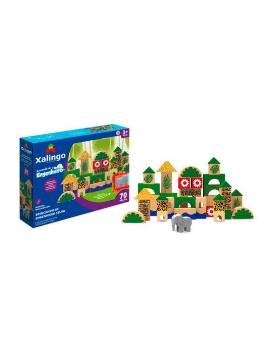 O Brincando de Engenheiro Selva é uma temática inspirada na selva, tornando a experiência de montar ainda mais envolvente e divertida. O conjunto é composto por 70 peças em madeira reflorestada, com ilustrações coloridas que estimulam o interesse e a imaginação das crianças.