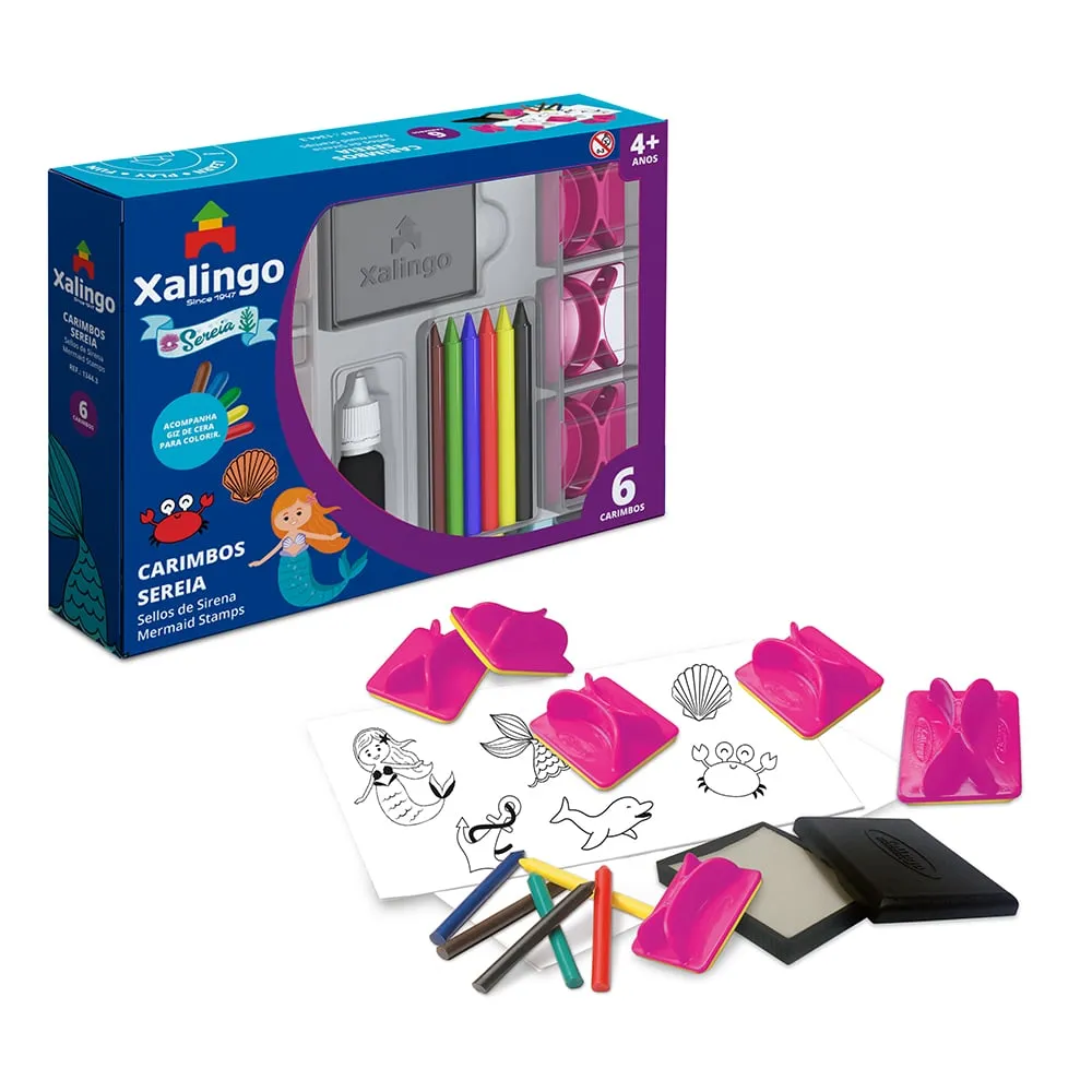 O conjunto Carimbos Sereia conta com 6 carimbos exclusivos, com cabo em plástico resistente e base em borracha atóxica, especialmente desenvolvidos para garantir segurança e diversão durante o uso. Acompanha 1 almofada para carimbo, 1 frasco de tinta atóxica, 1 bloco de papel e giz de cera para colorir as imagens carimbadas.